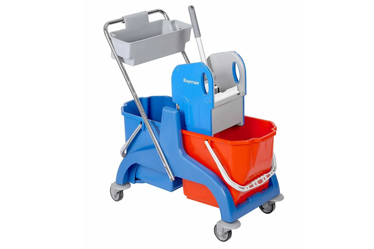 Пластиковая тележка нового поколения, с двумя вёдрами 2*25 л., лёгкая, манёвренная, большая грузоподъёмность, в комплекте: отжимное устройство, корзинка для моющих средств. Предназначена для ручной уборки помещений таких как: Торговый центр, гостиница, больница, ресторан, фабрика и учебные учреждения.