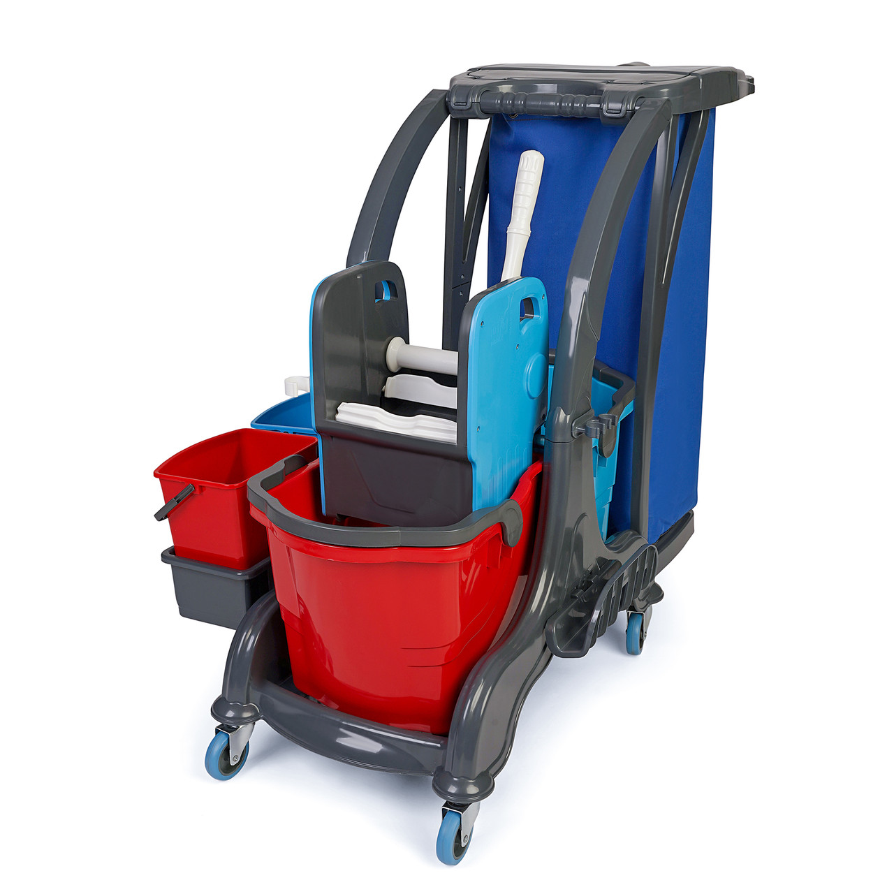 Тележка нового поколения, с двумя вёдрами 25 л., лёгкая, манёвренная, большая грузоподъёмность, в комплекте: отжимное устройство, корзинка для двух маленьких 5л. ведёр, многоразовый мусорный 120л. мешок. Материал из высокопрочного пластика ABS. Предназначена для ручной уборки помещений таких как: Торговый центр, гостиница, больница, ресторан, фабрика и учебные учреждения.