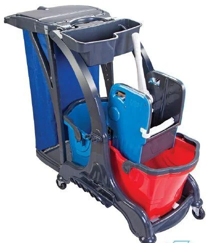 Тележка нового поколения, с двумя вёдрами 25 л., лёгкая, манёвренная, большая грузоподъёмность, в комплекте: отжимное устройство, корзинка для моющих средств, многоразовый мусорный 120л. мешок. Материал из высокопрочного пластика ABS. Предназначена для ручной уборки помещений таких как: Торговый центр, гостиница, больница, ресторан, фабрика и учебные учреждения.