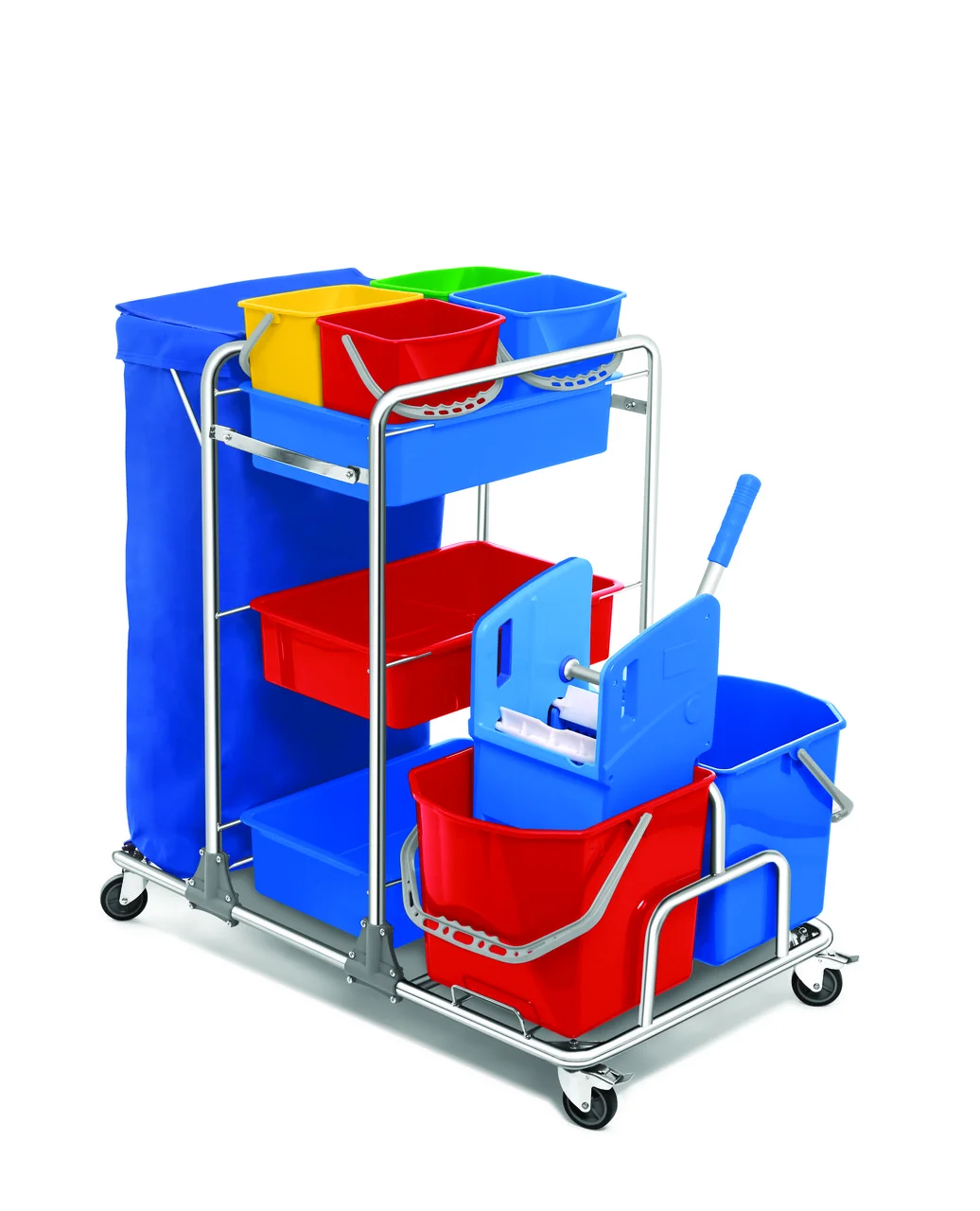 Предлагаем вам уникальный уборочный инвентарь – многофункциональную, сервисную уборочную тележку. Здесь есть всё для качественной уборки помещения: вместительный мусорный мешок, полочки для хранения моющих средств и принадлежностей, надежная система для отжима мопов, 4 ведра цветовой кодировки по 5л. Каркас сделан из нержавеющей стали. Платформа из ударопрочного пластика АБС. Управлять многофункциональной уборочной тележкой – легко и удобно. Надежные каучуковые колесики обеспечивают легкий ход.
