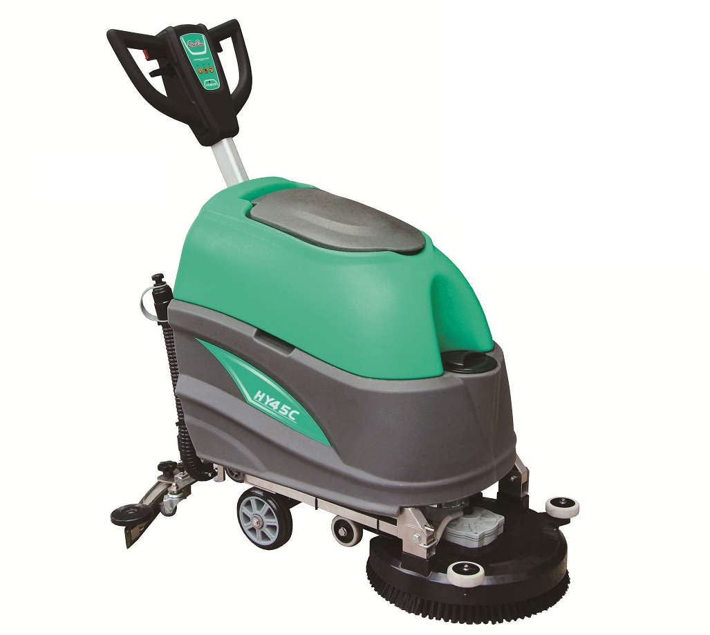 Кабельная, компактная поломоечная машина "HY45С" для глубокой и ежедневной чистки, площадей малого объёма от 2000 до 8000м2. Движение машины достигается за счёт вращения щётки, т.е. поломоечная машина тянет себя вперёд сама. Поломоечная машина HY45С очень легка в управлении и проста в эксплуатации. Металлическая всасывающая балка, для сбора грязной воды с изогнутыми краями, находиться сразу, после щётки, что дает возможность собирать грязь, не допуская ее растекания. Панель управления значительно упрощена. Она содержит лишь выключатель всасывающей турбины, электродвигателя привода щеток и подачи воды. Тем самым практически исключаются ошибки управления. Наряду с экономией места (бак для чистой воды помещен в стенке корпуса), это обеспечивает также уменьшенную вероятность повреждения вследствие минимизации числа конструктивных элементов. Длина кабеля 18 метров. Аналог Английской модели "NUMATIC", регулируемая ручка для клинеров-операторов.